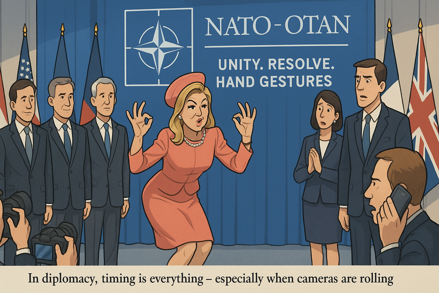 During the NATO summit in The Hague, Dutch Queen Máxima was caught on camera playfully imitating former U.S. President Donald Trump’s hand gestures while greeting delegates. The footage aired live before being lightly trimmed from official channels, though not before it circulated across diplomatic WhatsApp groups.